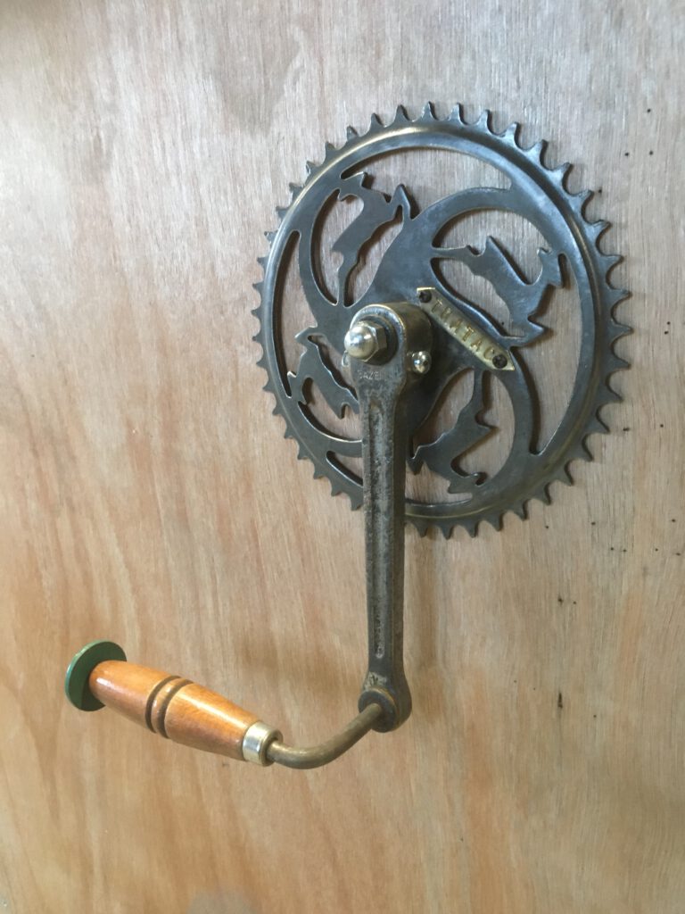 Van een oude fiets die in de oud ijzerbak lag sloopte ik het crankstel af. Met de roterende staalborstel heb ik em weer kunnen laten glimmen. Prachtig verweerd…